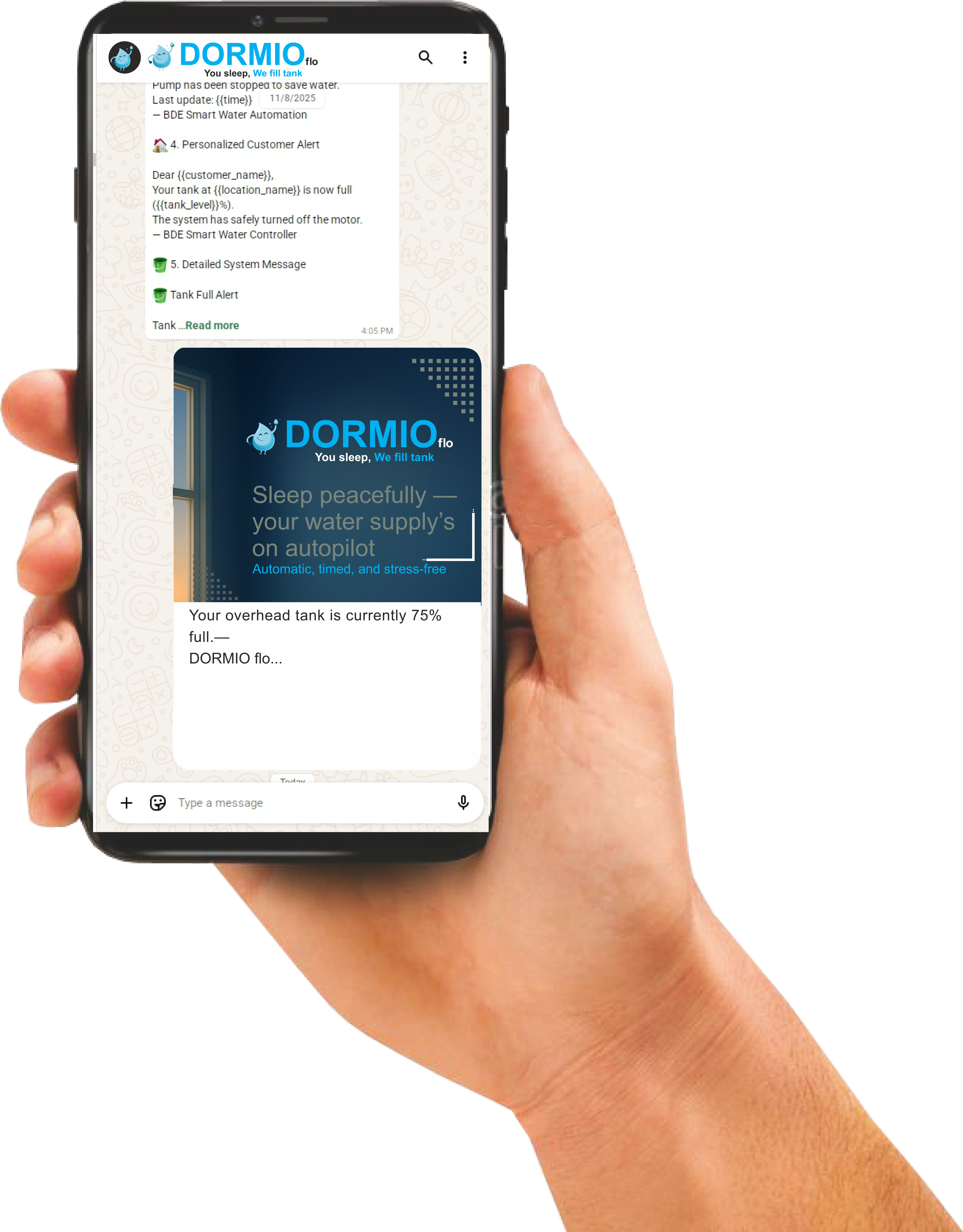 Instant updates: supply started, motor ON/OFF, tank full, or no supply detected.
